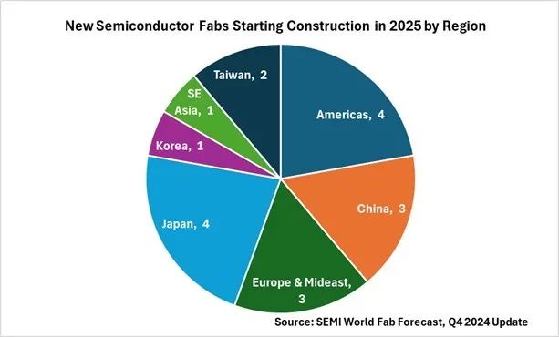 從地域分布來看,美洲和日本在這一波建設熱潮中處于領先地位,各自計劃建設4個項目。中國大陸與歐洲&中東地區(qū)緊隨其后,并列第三,分別計劃建設3個項目。此外,中國臺灣計劃建設2個項目,而韓國和東南亞則各計劃建設1個項目。這一分布不僅彰顯了全球半導體產(chǎn)業(yè)的多元化發(fā)展趨勢,也反映了各地區(qū)對半導體產(chǎn)業(yè)的高度重視和積極投入。
